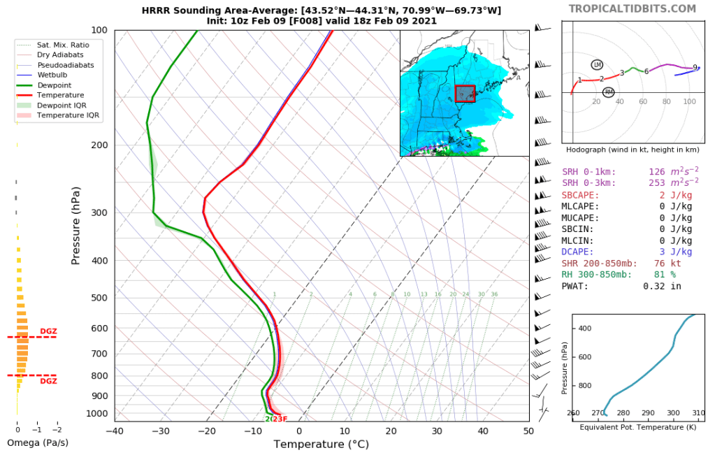 The six-sided dendrites we all imagine when we think of snowflakes can only form under certain atmospheric conditions. They need temperatures between -12 and -18C, high relative humidity, and upward motion. The more space in the atmosphere that these conditions are satisfied, the more dendrites we’ll get and the fluffier the snow will be. On the chart above, which represents the average forecast conditions over southwestern Maine, we see that the layer of -12 to -18C temperatures (Dendritic Growth Zone = DGZ) spans several thousand feet (800mb = 6000 ft, 625mb = 13000ft). In that layer, the dew point is nearly equal to the temperature (green and red lines are close), and we have about 1 Pa/s of upward motion (little orange bars off to the left where the DGZ is highlighted). This is a strong signal for high ratio snow!