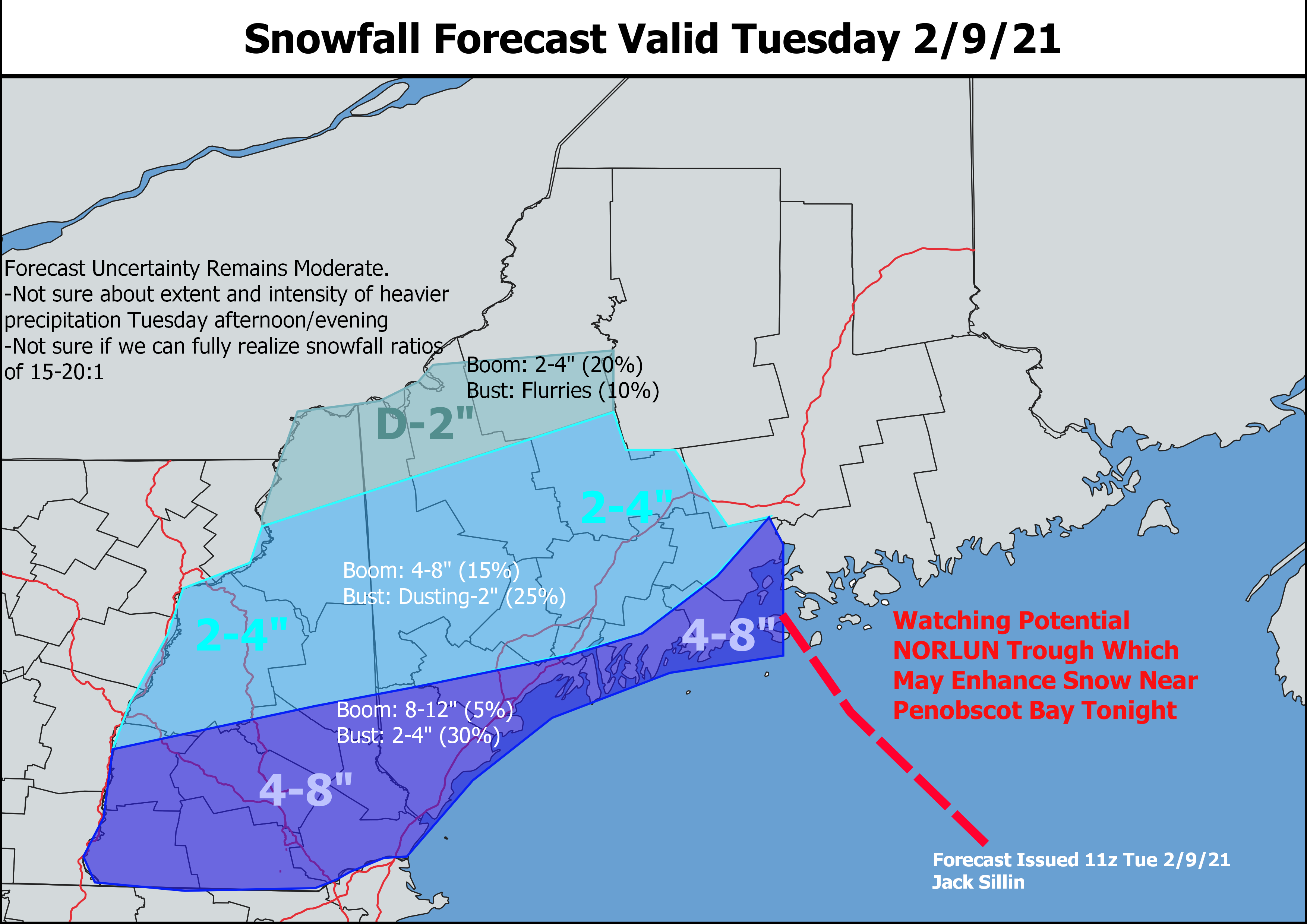Just like the last storm, I don’t think we’ll push towards the upper end of the 4-8″ zone, but I am expecting quite a few 4 and 5″ reports with a few 6-7″ jackpot winners probably between Nashua and Portsmouth NH. One wildcard in the forecast is the potential for an inverted NORLUN trough to give snow a boost near Penobscot Bay. Model guidance is notoriously challenged by these features, but if such a trough can push onshore, I’d expect to see a few spots between Boothbay and Belfast join the 6″+ club.