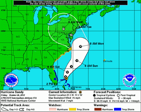 Sandy is currently a Category 1 storm with top winds of 75mph. Below is the full NHC advisory.
