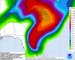 Sandy will then be a Nor’Easter on steroids. This super-noreaster will then move into the coast south or on top of New York City. Surge flooding will be of great concern. There is a 5 foot seawall protecting the financial district from New York Harbor. This storm will be over 2500 miles wide and close to 3500 miles long. This huge storm will generate a 9-12 foot surge on top of the astronomical high tide caused by the full moon on Monday. This would most likely cause flooding in lower Manhattan.