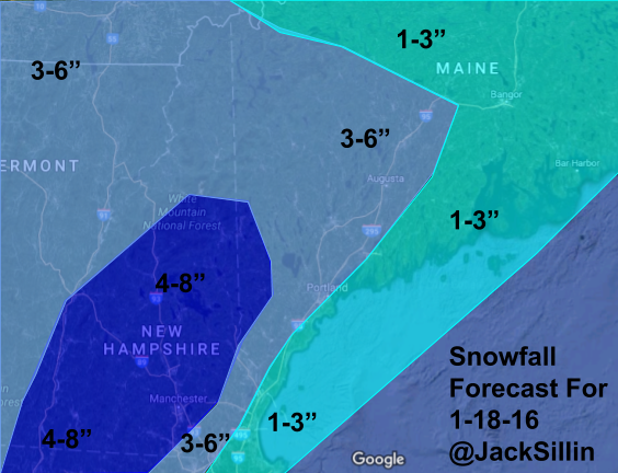 Here’s what I think everyone will end up with when all is said and done on Wednesday afternoon. The coast sees the least due to mixing and totals drop off to the NE as less precip will fall there. The Jackpot will be in NH and far W ME where 6-8″ are possible in the foothills and mountains. This will be a great refresh for the ski areas especially those in the whites and places in Maine like Sunday River, Shawnee Peak, and Mt Abram. Farther NE, Sugarloaf will definitely get some flakes but won’t have the lift to squeeze out more than 2 or 3″. I’ll see if I have time to update this tomorrow before the flakes fly.