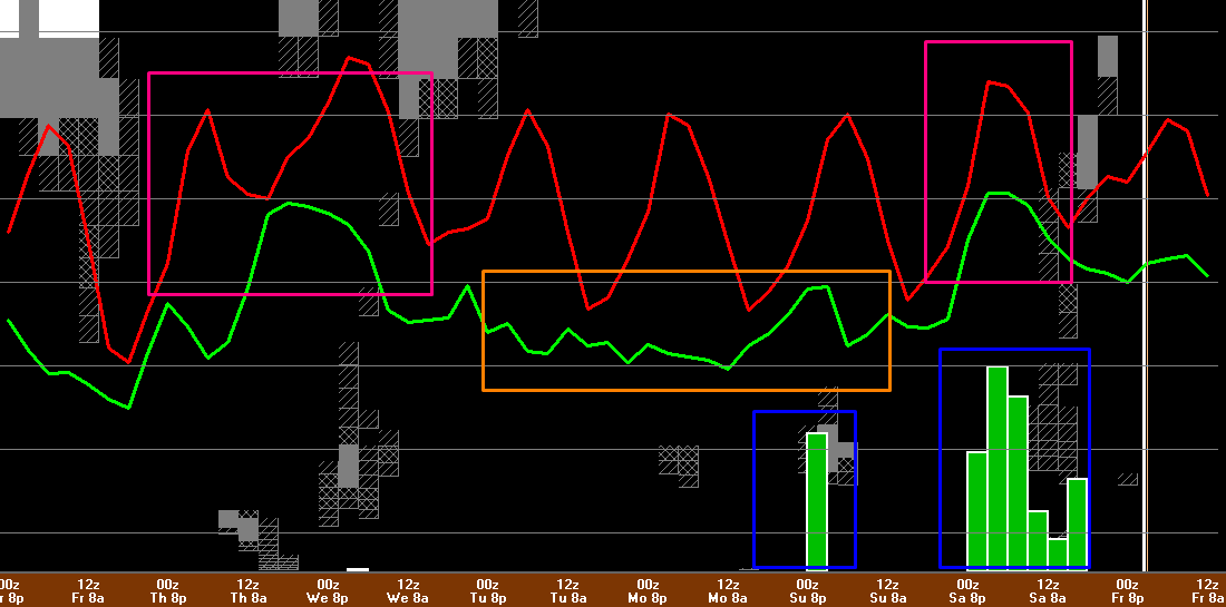 What happens after the front drifts offshore Saturday night? Cooler and drier weather is in the forecast for Sunday and into early next week (orange box, look at those dew points (green line)!). A spot shower is possible Sunday but otherwise the rest of the outlook looks fairly dry as we continue to grow our rain deficit. More heat and humidity threatens by mid to late next week.