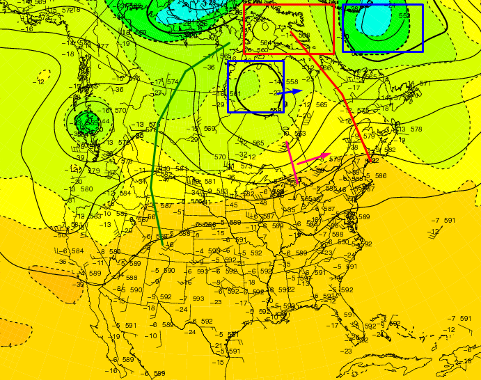 The current pattern is quite amplified for the summer months. A large ridge extends from New England to Baffin Bay (red line) with an Omega block over Baffin Island (red box). Low pressure flanks this high both over the North Atlantic just south of Greenland and over Hudson Bay (blue boxes). The Hudson Bay low is the one we really care about because our disturbance is moving along the southern flank of it (pink line and arrow). Because of the wall of high pressure to its east (red line/box), both the low and the disturbance have nowhere to go. The high isn’t moving particularly fast because the whole pattern is blocked up (low S of Greenland, high to its east, low to the east of that, high to the east of that, and so on). Because of the blocked pattern, I tend to think that everything will be moving a little slower which would lead me to lean a little bit towards the NAM solution of higher energy.