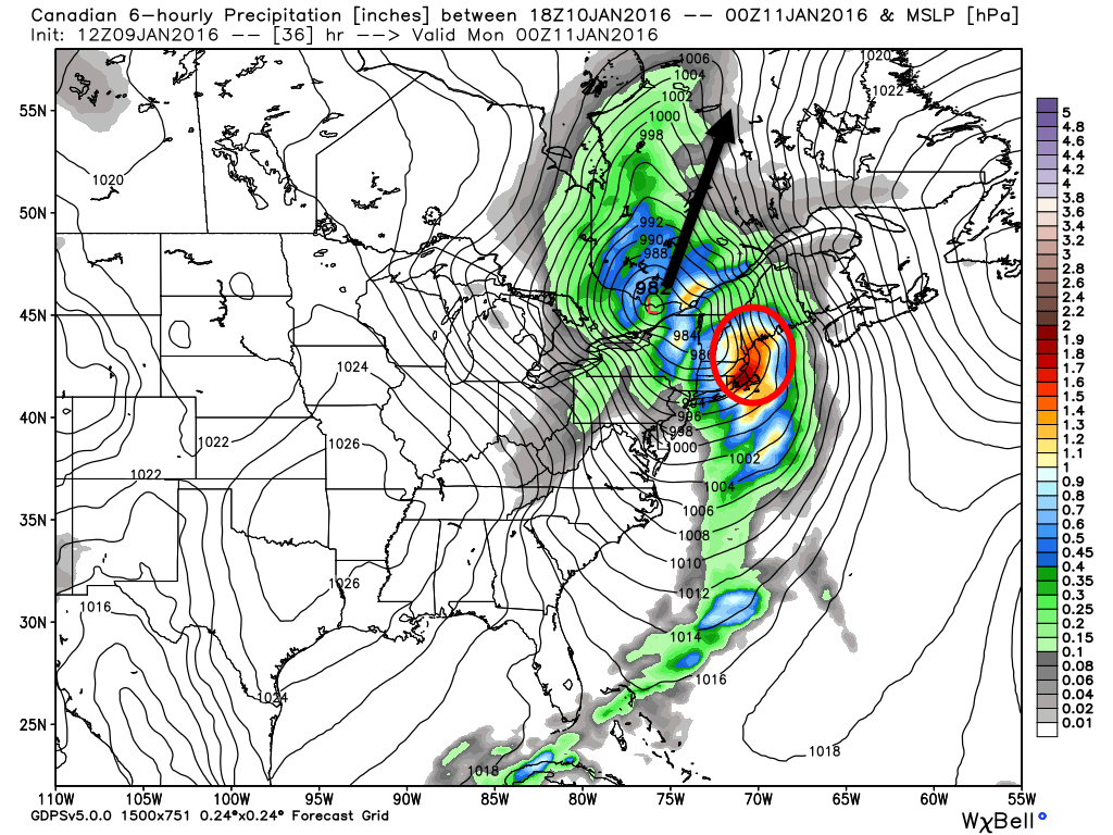 12Z GEM Showing Low Pressure Moving To Our West (Black Arrow) And Heavy Rain Over Our Area (Red Circle). Image Credit: Weatherbell