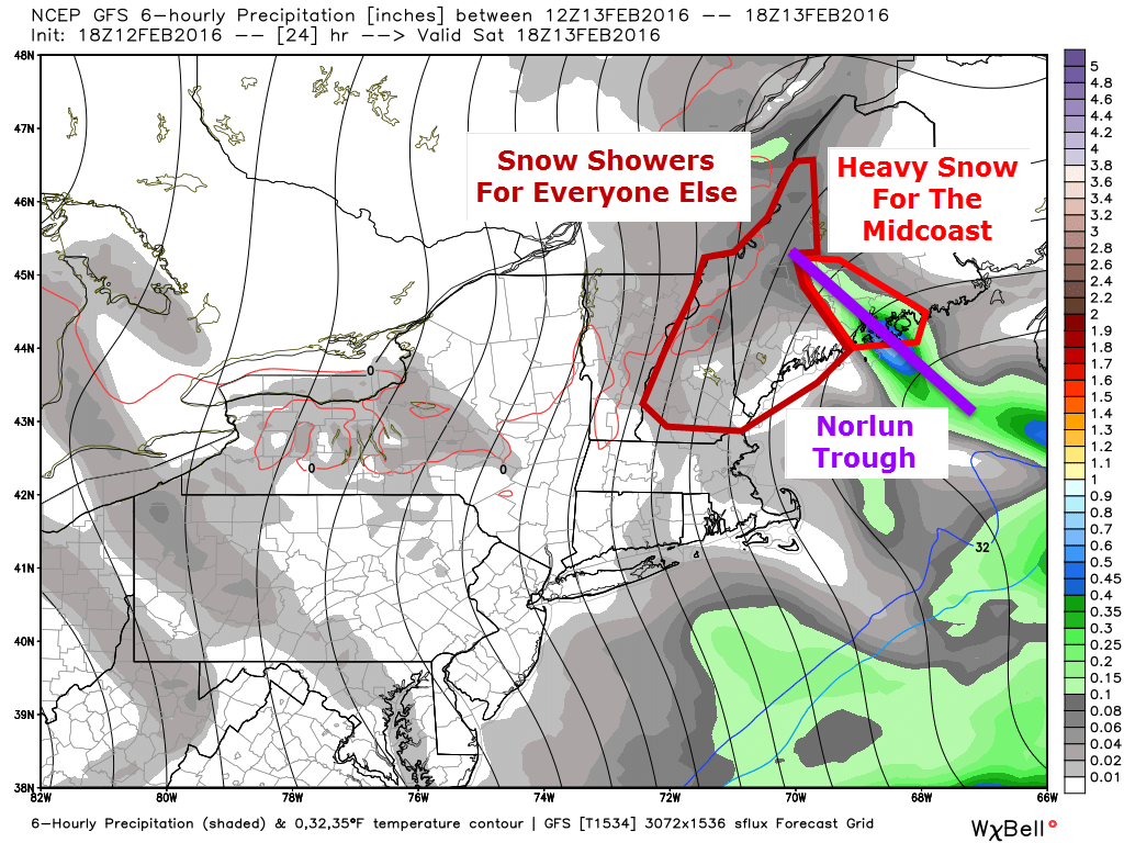 One of those will form over the midcoast and deposit heavy snow tomorrow. Totals are likely to come it at around a foot in the core of the trough but it remains to be seen exactly where that sets up. These events are notoriously fickle and can set up wherever they please or not at all. One good example happened just last night when a weak Norlun formed over Portland out of left field causing major issues. Bottom line: expect the unexpected.